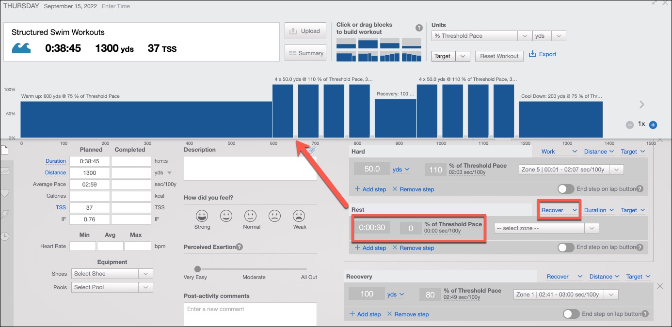 TrainingPeaks builder is a building block style tool that allows you to quickly drop workout blocks into a swim and then modify some of the details of each one.