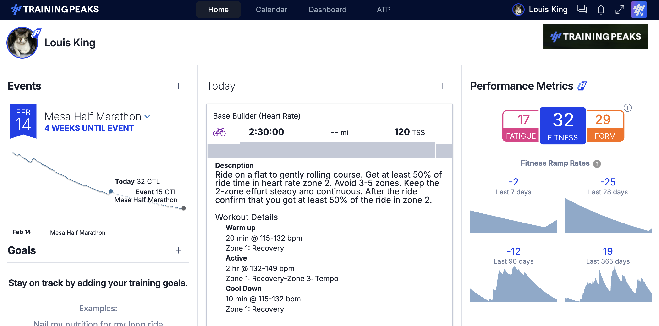 The Home view gives you a single place to view your long-term events and goals, your upcoming workouts, and fitness trends. Putting this important information together on a single page acts as a snapshot of your main goals and how you are progressing towards them. Please note that some features are only available to Premium Athletes.