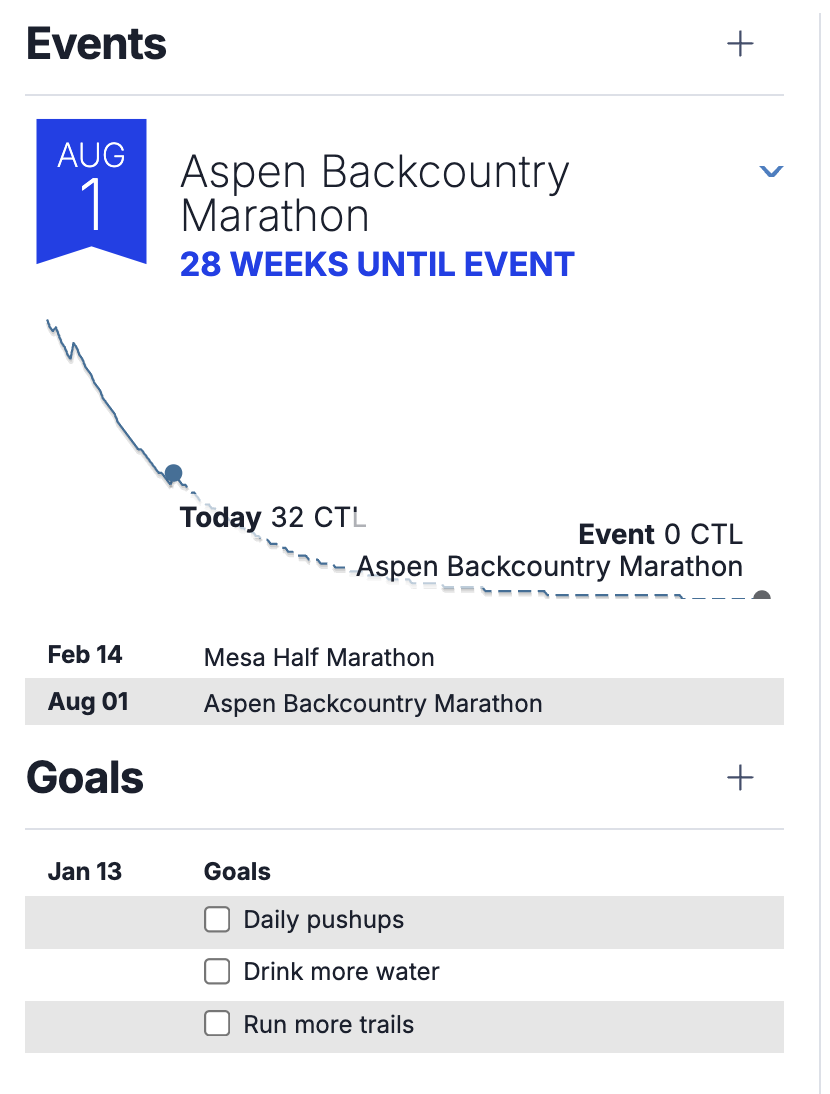 You can change your focus event by clicking on the arrow next to the countdown. The default is your next A Race. You can also add additional Goals and Events by clicking on the + sign.