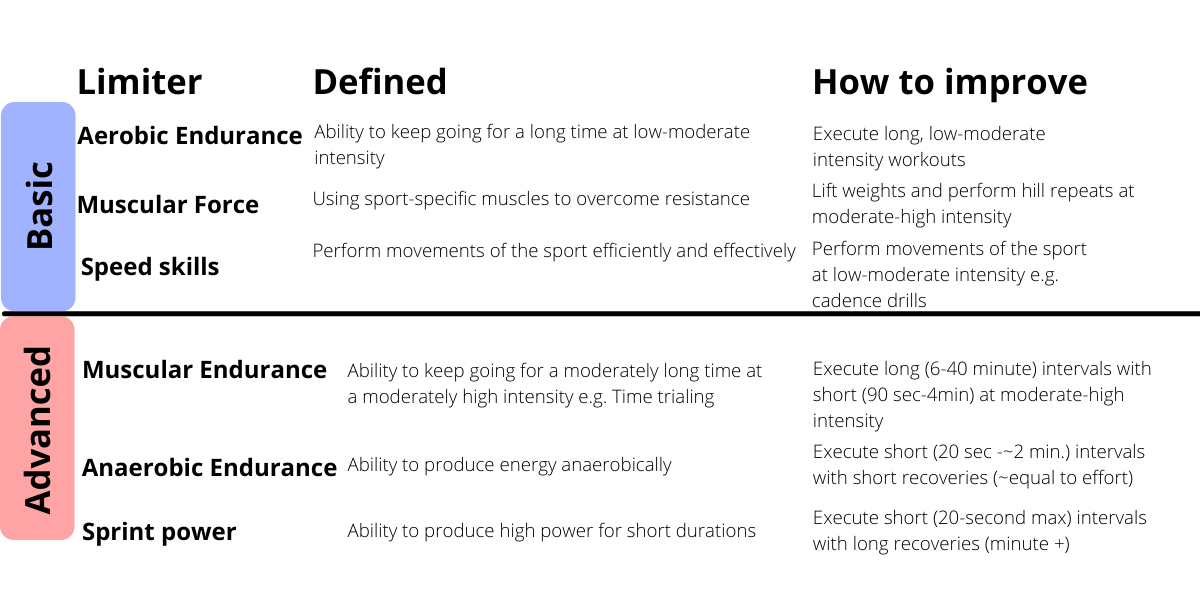 How do you know what your limiter is? You have a limiter when your weakness matches up with the demands of a race. e.g. you have poor sprinting ability and you want to excel at a criterium.