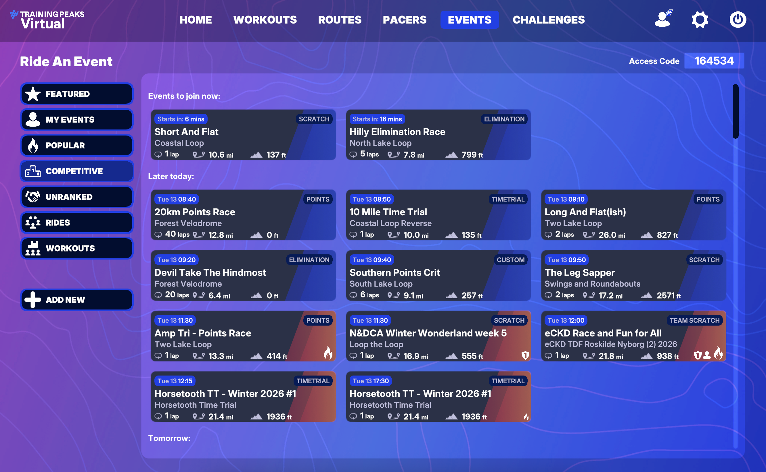 TrainingPeaks Virtual has a repeating roster of default events, with races beginning every 5 minutes. In addition, you can create your own events, customized to be just how you like them, at any time.