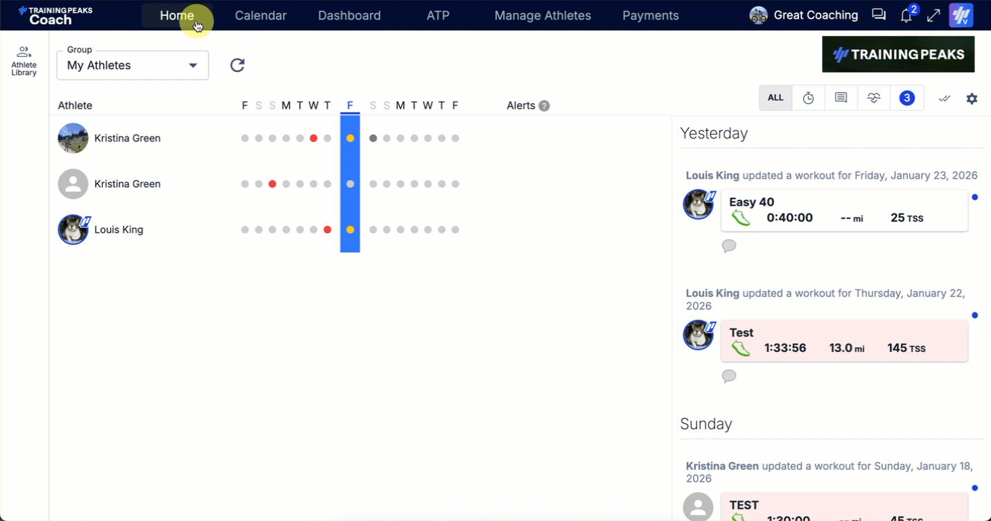 Hold key Option and 1 to navigate to the Home page in an Athlete or Coach Account.