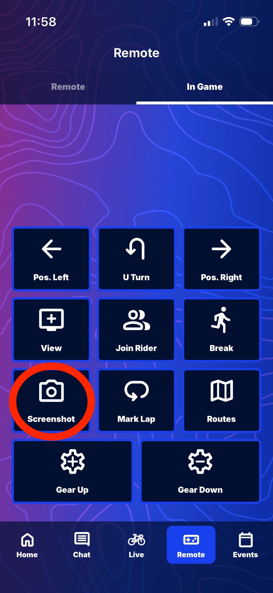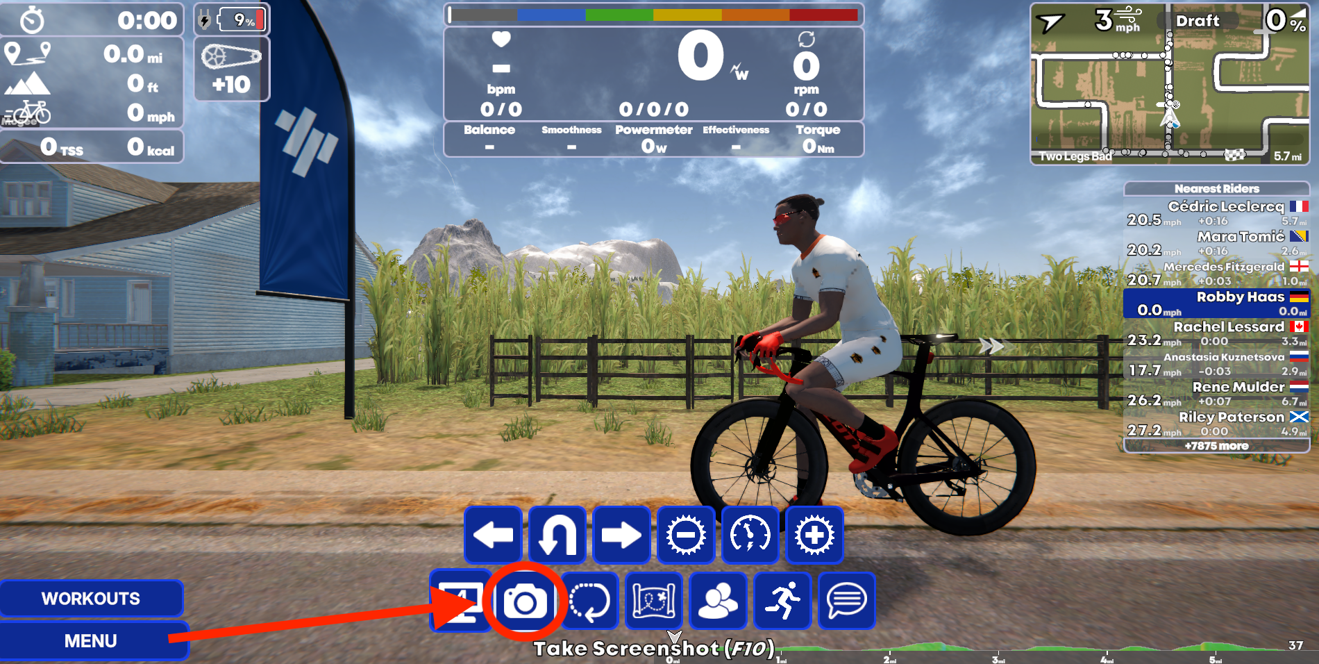 Screenshots will automatically be taken when anything notable happens during your ride - for example, when completing a workout, finishing an event, receiving a change in rating/ranking, or bagging an achievement. Additionally, you can manually take a screenshot during your virtual ride using any of the following options.